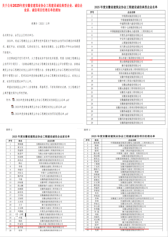 在安徽省建筑業(yè)協(xié)會(huì)同期開展的2025年度評(píng)選中,黃山市建工集團(tuán)股份有限公司被授予 “2025年度安徽省工程建設(shè)誠信典型企業(yè)” 榮譽(yù)稱號(hào)。這是對(duì)我公司長期以來遵守市場(chǎng)秩序、嚴(yán)格合同履約、積極承擔(dān)社會(huì)責(zé)任等方面表現(xiàn)的褒獎(jiǎng)。
