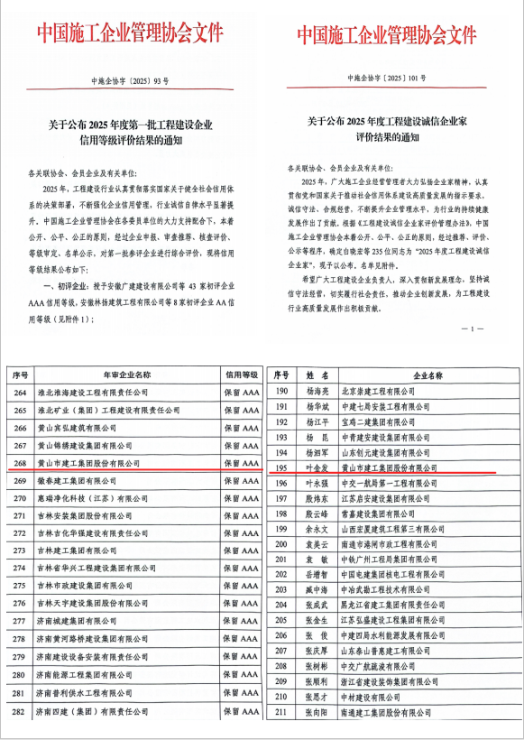 近日,國家及省級(jí)行業(yè)協(xié)會(huì)相繼公布關(guān)于2025年度工程建設(shè)領(lǐng)域系列信用評(píng)價(jià)與先進(jìn)評(píng)選的結(jié)果,黃山市建工集團(tuán)股份有限公司憑借卓越的綜合實(shí)力、良好的市場(chǎng)信譽(yù)和穩(wěn)健的經(jīng)營表現(xiàn),在多個(gè)權(quán)威評(píng)選中脫穎而出,收獲累累碩果,再次彰顯了公司在行業(yè)內(nèi)的領(lǐng)先地位與誠信標(biāo)桿形象。
