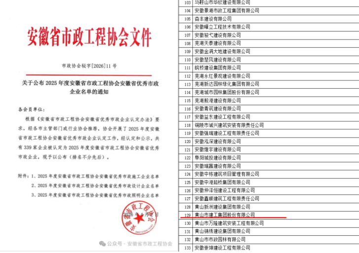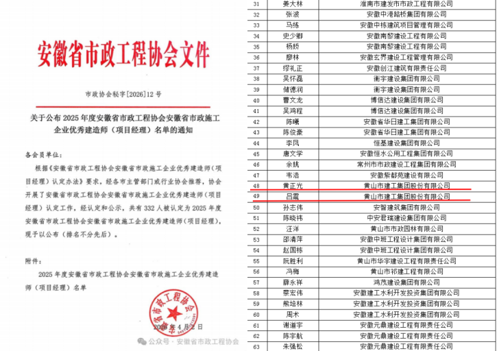 近日,安徽省市政工程協(xié)會(huì)發(fā)布了《關(guān)于公布2025年度安徽省市政工程協(xié)會(huì)安徽省優(yōu)秀市政施工企業(yè)名單的通知》及《關(guān)于公布2025年度安徽省市政工程協(xié)會(huì)安徽省市政施工企業(yè)優(yōu)秀建造師(項(xiàng)目經(jīng)理)名單的通知》。黃山市建工集團(tuán)股份有限公司憑借卓越的綜合實(shí)力與優(yōu)質(zhì)的工程業(yè)績,連續(xù)多年榮登“2025年度安徽省優(yōu)秀市政施工企業(yè)”榜單。這也是繼集團(tuán)獲“2024年度安徽省優(yōu)秀建筑業(yè)企業(yè)”后,在工程建設(shè)領(lǐng)域收獲的又一重量級(jí)榮譽(yù)。 同時(shí),黃正光、呂震兩位同志憑借扎實(shí)的專業(yè)素養(yǎng)和出色的項(xiàng)目管理能力,雙雙榮獲“安徽省市政施工企業(yè)優(yōu)秀項(xiàng)目經(jīng)理”稱號(hào)。